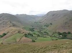 Boredale runs in a northerly direction for a distance of 4.5 km from its head at Boredale Hause to its convergence with the valley of Martindale. It is a thinly populated valley with the structures of Garth Heads, Howsteadbrow, Nettleslack and Boredale Head being the only inhabited buildings in the valley. The traditional stone and slate Nettleslack cottage dates from 1756, it was modernised in 1997 and is now rented out as holiday accommodation.[1] There is a narrow tarmac road which runs up the valley for 2.5 km until it reaches the farm of Boredale Head, from here the road becomes a bridleway which climbs up on to the fells and reaches Boredale Hause at a height of 399 metres. Footpaths also leave the valley at the farm buildings of Garths Head and climb the hillsides to reach the summits of Place Fell and Beda Fell.