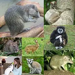 | From top to right: Desmarest's hutia, Sunda colugo, brown rat, European hare, lar gibbon, human playing with a rabbit, ring-tailed lemur, and a common treeshrew. Representing the orders: Dermoptera, Rodentia, Primates, Lagomorpha, and Scandentia, comprising Euarchontoglires. | |
