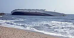 She was renamed again, this time to La Jenelle. The new owners brought her to Port Hueneme, California, where they intended to sell her. Some say that plans were underway to make her a floating restaurant/casino. Others claim she was to be sold to an Indonesian shipping firm, but neither plan materialized. By 1970, she was anchored outside the harbor to avoid expensive docking fees while efforts were made to find a buyer. On April 13, her luck ran out. That particular day was blustery, with a northwest gale ripping the tops off the waves. Seas broke everywhere, and nearly everyone was in port. La Jenelle's starboard anchor – the only one out – began to drag. There were only two crewmen aboard, and they were unable to stop her drift. Only 23 minutes later, she struck the sandy beach west of the Port Hueneme breakwater, her stern just missing the rocks. La Jenelle began to list as she took on water. The crew stayed aboard, attempting to pump her dry so she could be righted, but the seas were pouring in from many smashed portholes and windows making their efforts fruitless. A helicopter arrived to rescue them as the ship settled further into the sand.[16][17]
