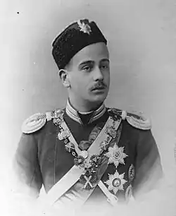 1911 was a busy year for the grand duke. He was made colonel and in April he represented Russia at the Turin World Fair and the Fine Arts Exhibition in Rome during the celebrations for the 50th anniversary of Italy's unification.[22] On 22 June 1911, he represented his cousin Tsar Nicholas II at the coronation of Britain's King George V in Westminster Abbey.[22] In November the same year, he was Russia's emissary at the coronation of Vajiravudh the King of Siam.[24] On his way back to Europe, he visited Egypt and Greece.[15] Between 1910 and 1914, he wore the uniform of colonel of His Imperial Highness the Tsarevich Atamansky Guards Cossack Regiment. In 1914, he became a major general.[25]