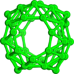 Borospherene (B40) is an electron-deficient cluster molecule containing 40 boron atoms. It bears similarities to other homoatomic cluster structures such as buckminsterfullerene (C60), stannaspherene, and plumbaspherene, but with a different symmetry.[1][2][3] The first experimental evidence for borospherene was reported in July 2014, and is described in the journal Nature Chemistry.[4] The molecule includes unusual hexagonal and heptagonal faces. Despite many calculation-based investigations into its structure and properties, a viable route for the synthesis and isolation of borospherene has yet to be established, and as a consequence it is still relatively poorly understood.