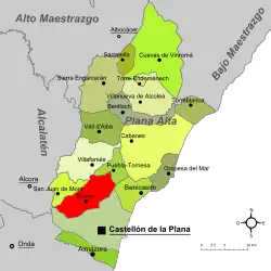 Borriol is situated in a valley between the Desert de les Palmes and the Serra de Borriol mountains, in the southwest of the comarca of Plana Alta.[6] The municipality of Borriol borders the municipalities of Sant Joan de Moró, Vilafamés, La Pobla Tornesa, L'Alcora, Benicàssim and Castellón de la Plana, all belonging to the Province of Castellón. The proximity to the provincial capital of Castellón de la Plana makes Borriol a dynamic town with a growing economy. The local landscape is typical of the Mediterranean, with dry fields with olive and carob trees,[7] next to the mountains of the Paraje Natural del Desierto de las Palmas. Borril is accessed by the CV-151 and CV-10 roads.