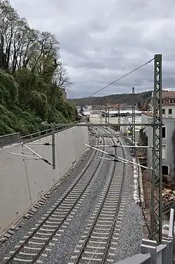 In 2013, the upgrade of the section used by the S-Bahn Dresden was carried out, which involved blockading of the line between Meißen Triebischtal and Meißen. The new Meißen Altstadt station was built near the centre of Meißen. In addition, the second track was restored in the section between Meißen Altstadt and Meißen.[5] With the completion of the work, the S1 service to Meißen Triebischtal was restored on 30 November 2013.[6]