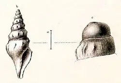 The spire is conical, with profile-lines interrupted by the prominence of the keel, from which both above and below is a contraction into the suture. The apex consists of 2 tumid rounded whorls of nearly equal size, with a very slight suture. There are 8 whorls in all, of slow and regular increase. The body whorl is small, with a rounded conical base and a smallish snout. The whorls are angularly convex, with a slight contraction into the suture, both at top and bottom of the whorls. The suture is a little impressed, rather oblique. The aperture is small and narrow, pear-shaped, scarcely angulated above, and drawn out into a rather narrow siphonal canal in front. The outer lip is regularly curved above and flat in front; the edge retires slightly below the suture, so as to form the deep rather narrow sinus, whose lower side is made by the very high and prominent shoulder, which advances very far forward, and still continues to do so though more slightly on to the edge of the canal, where it again retires to the left. The inner lip has a thin glaze on the body and columella whose union is very slightly concave. The generic fold is a prominent, rounded, narrow thread which coils round the columella about the middle and parallel to the suture. The front of the columella is narrow, twisted, and oblique.[2]