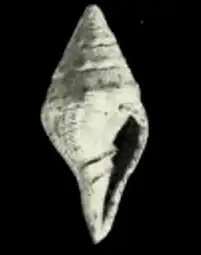 Sculpture: The indistinctly turreted whorls have a broad shoulder showing deeply curved growth-lines. Below the faint angle there are short axial costae which are very little raised and broadly convex, about 10 on a whorl. On the body whorl they are very oblique, and vanish on the lower half. The axials are knobby and squarish on the spire whorls. They are crossed on the spire by five fine spiral threads, and the whole of the body whorl is spirally lirate. Oblique curved growth-lines are distinctly visible. The spire is conical, of nearly the same height as the aperture with siphonal canal. The outlines are straight with an angle of 50°. The protoconch is broken off, but evidently very small. The shell contains six whorls without the protoconch, first slowly then more rapidly descending, angled at the lower third, the broad shoulder slightly concave. The body whorl is convex below the angle and contracted at the base. The suture is well impressed, slightly wavy. The aperture is very narrowly pear-shaped, lightly channelled above, gradually narrowing below into a comparatively long, narrow, and open siphonal canal, its base truncated. The outer lip is damaged, convex above, very faintly excavated further down. The columella is slightly oblique, with two well-pronounced oblique plaits at the middle, very faintly deflected towards the canal. The inner lip is thin and narrow.[3]