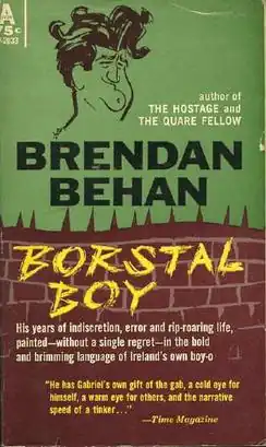 Borstal Boy is a 1958 autobiographical book by Brendan Behan. The story depicts a young, fervently idealistic Behan, who loses his naïveté over the three years of his sentence to a juvenile borstal, softening his radical Irish republican stance and warming to his British fellow prisoners.[1] From a technical standpoint, the novel is chiefly notable for the art with which it captures the lively dialogue of the Borstal inmates, with a variety of the many subtly distinctive accents of Britain and Ireland intact on the page. Ultimately, Behan demonstrated by his skillful dialogue that working class Irish Catholics and English Protestants actually had more in common with one another through class than they had supposed, and that alleged barriers of religion and ethnicity were merely superficial and imposed by a fearful middle class.