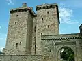 The castle was built at the site of an earlier structure, and it remains the Borthwick family ancestral seat. Sir William Borthwick, later the 1st Lord, obtained from King James I on 2 June 1430 a licence to erect on the Mote of Locherwart, a castle or fortalice.[5] This was unusual in Scotland as nobles generally did not need to get permission for the building and fortifying of a Castle.[6] He acquired a large part of Locherworth from his neighbour William Hay who was resentful of this and jealous of his neighbour's castle.[7] The well-preserved medieval effigies of the builder and his lady can be seen in the nearby parish kirk of St Kentigern, which retains a 15th-century aisle also probably built by him. It was originally a stone enclosure fortress centring on an unusually tall tower house with walls up to 14 feet (4.3 m) thick and 110 feet (34 m) in height. The design is a 'U-shaped' keep with a 12-foot (3.7 m) gap between the projecting, slightly asymmetrical, towers. There was a surrounding defensive courtyard with round towers pierced with shot-holes at the corners. While the tower house itself is exceptionally well preserved for its date, the surrounding wall and towers are much restored.