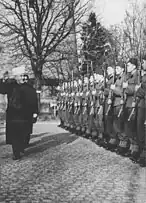 During World War II Bosnia was annexed as a part of the Independent State of Croatia, a Nazi Puppet State where the Bosniaks were seen as Croat Muslims. Although their ethnicity was not allowed Muslims enjoyed religious freedom, but from 1941 to 1945 the Muslims especially around Sandžak, Podrinje and Herzegovina were openly attacked, massacred, burned alive and raped by Chetnik Militia in rural Bosniak villages.[23] Due to the failure of the Ustaša regime many Bosniaks joined the Yugoslav Partisan Movement, such as Sulejman Filipović. The Ustashe, attempting to secure their Eastern Border from Partisans and Chetniks formed Hadžiefendić Legion and the Hadnschar Division and the Germans formed the Sandžak Muslim Militia in Sandžak. Although open to Chetnik attacks for years the local Bosniak intellectual elite gathered together to form a resolution of a total of 108 Bosniak intellectuals in Prijedor (September 23, 1941), Sarajevo (October 12, 1941), Mostar (October 21, 1941), Banja Luka (November 12, 1941), Bijeljina (December 2, 1941), Tuzla (December 11, 1941) and Zenica (May 26, 1942).[24] The basis for the Resolution of Sarajevo Muslims was a resolution declared by El-Hidaje, an association of ulama from Bosnia and Herzegovina on its assembly held on August 14, 1941. It was written by Mehmed Handžić and Kasim Dobrača. All Muslim resolutions of 1941, including the Resolution of Sarajevo Muslims, contain the following elements: