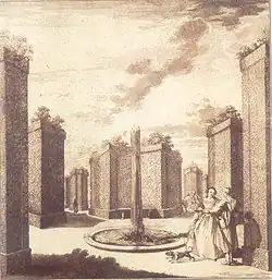 - ^ "closet of greenery", where cabinet/closet signifies a small intimate chamber. A larger bosquet room at the centre of a high-hedged bosquet can be called a salle, as in the Gardens of Versailles, for example the Salle des Antiques where twin stone-edged rills punctuated by marble copies of Roman sculptures defined an "island" of parterre, surrounded by a gravel walk, with exedrae cut into the surrounding green walls (ref. "Salle des Antiques")