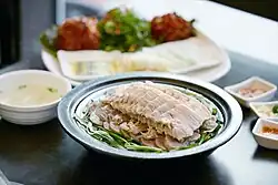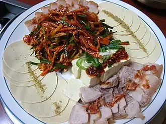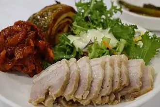 Bossam (Korean: 보쌈) is a pork dish in Korean cuisine. It usually consists of pork shoulder that is boiled in spices and thinly sliced.[1] The meat is served with side dishes such as spicy radish salad, sliced raw garlic, ssamjang (wrap sauce), saeu-jeot (salted shrimp), kimchi, and ssam (wrap) vegetables such as lettuce, kkaennip (perilla leaves), and inner leaves of a napa cabbage.[2][3]