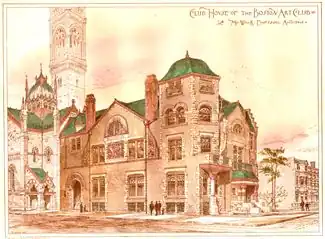 According to art historian Nancy Jarzombek, "Charles Callahan Perkins met with an old friend, amateur painter and music publisher George D. Russell, to discuss reviving the Boston Art Club. With Perkins at the helm they called a general meeting, and the suddenly revived club opened its membership to upper-class men who professed an interest in art (it remained firmly closed to women for the next six decades). The Club engaged a bow-front brick townhouse on Boylston Street for its quarters. In 1871, Perkins, Russell and Horace H. Moses, none of them professional artists, signed the petition to incorporate the Art Club and Perkins was elected President. The Club added a spacious picture gallery behind the building and in 1873 opened its first annual exhibition. From an informal artists' supper club, Perkins created a refined gentlemen's club with dining and reading rooms, an extensive library, paintings collection and a picture gallery. It hosted two juried exhibitions annually and had a large general membership. The Club also hosted informal gatherings for its members on the first Saturday of each month. Artists would bring in prints or watercolors to critique."[1]