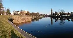 The river is known as meandering and extremely slow, especially during the summer when the water level can be very low.[6][10] That's why some suggest the origin of the name deriving from the Turkish language: bosh for empty or desolate and sut for water.[11][3] Due to such a flow, the river has a specific ecosystem, abundant in fish,[7] marsh plants and a deep deposit of silt from their rotting.[10]