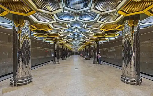 Hexagons associated with honeycombs are a key element in the design of the station. The honeycomb-shaped ceiling makes it possible to successfully hide lamps inside it, and this provides a soft, warm illumination of the platform below. The light-colored floor is made of porcelain stoneware, the columns are covered with sheet metal.[11]