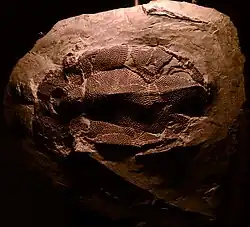 Bothriolepis (from Greek: βόθρος bóthros, 'trench' and Greek: λεπίς lepis 'scale') was a widespread, abundant and diverse genus of antiarch placoderms that lived during the Middle to Late Devonian period of the Paleozoic Era. Historically, Bothriolepis resided in an array of paleo-environments spread across every paleocontinent, including near shore marine and freshwater settings.[1] Most species of Bothriolepis were characterized as relatively small, benthic, freshwater detritivores (organisms that obtain nutrients by consuming decomposing plant/animal material), averaging around 30 centimetres (12 in) in length.[2] However, the largest species, B. rex, had an estimated bodylength of 170 centimetres (67 in). Although expansive with over 60 species found worldwide,[3] comparatively Bothriolepis is not unusually more diverse than most modern bottom dwelling species around today.[4]