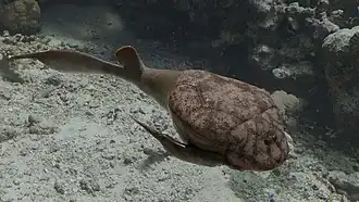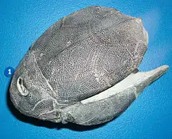 Bothriolepis had a long pair of spine-like pectoral fins, jointed at the base, and again a little more than halfway along. These spike-like fins were probably used to lift the body clear off the bottom; its heavy armor would have made it sink quickly as soon as it lost forward momentum.[2][12] It may also have used its pectoral fins to throw sediment (mud, sand or otherwise) over itself. In addition to the pectoral fins, it is originally considered to have two dorsal fins, but existence of a low, elongated anterior dorsal fin was denied in 1996, and now it is considered to have only a high rounded posterior dorsal fin.[13] The caudal tail was elongated, ending in a narrow band, but is unfortunately rarely preserved in fossils.[9] Bothriolepis lacked pelvic fins. Early antiarchs like Parayunnanolepis had pelvic fins, which implies secondary loss of pelvic fin in Bothriolepis.[14]