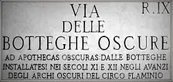 Botteghe Oscure was established in 1948.[1][2] The magazine was named after Rome’s via delle Botteghe Oscure (Latin: Ad Apothecas Obscuras), where the editorial office was located;[1] during the Middle Ages the street's "dark shops" came to be installed under the dark arches of the Circus Flaminius.