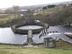 The reservoir was obliged to release ten million gallons a day. To ensure this, a gauging basin 40 feet (12 m) in diameter was built. The drinking water flowed through the Mottram Tunnel to the Godley covered reservoir.[3]