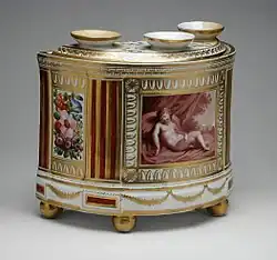 A bough pot is a vessel for holding stems of flowers and branches to decorate an interior, especially a fireplace during summer. They are typically ceramic, and have a body to hold water, with a number of small openings for the stems in the top. Often the top lifts off. The tulipiere and flower brick are types that allow larger numbers of flowers.