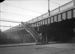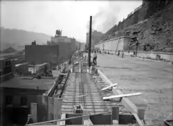 Work began with the widening of Second Avenue to a width of 70 feet (20 m) between Liberty Avenue and Grant Street in 1920–21.[4] The boulevard itself was built on an elevated viaduct beginning at Second Avenue and Grant Street and climbing over the Panhandle Route tracks onto the Bluff, where the roadway then followed the cliff edge eastward to Oakland. The project was an engineering challenge requiring extensive grading and numerous retaining walls and viaducts. Prior to completion, the cost was reported as $1.6 million per mile, said to be the most expensive road in the world at the time.[5] The first section of the boulevard from Downtown to the intersection with Forbes Avenue at the edge of West Oakland opened on October 2, 1922, and was formally dedicated a month later on Armistice Day.[6] The remainder of the route, extending to Schenley Park partly along the existing Emily and Wilmot Streets, was completed in 1930.[7]