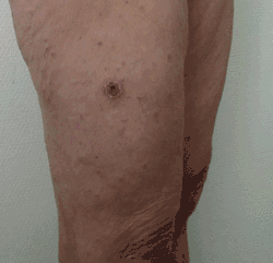 | Typical eschar and spots on the leg of a patient with Boutonneuse fever[1] | |