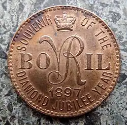 During the 1900 Siege of Ladysmith in the Second Boer War, a Bovril-like paste was produced from horsemeat within the garrison. Nicknamed Chevril (a portmanteau of cheval, French for horse, and Bovril) it was made by boiling down horse or mule meat to a jelly and serving it as a tea-like mixture.[8][9] Bovril also produced concentrated, pemmican-like dried beef as part of the British Army emergency field ration during the war. The ration came in the form of a pocket-sized tin can that contained the beef on one half alongside a dried cocoa drink on another half. The dried beef could be eaten alone, or mixed with water to create a beef tea.[10]