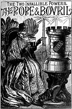 Bovril holds the unusual distinction of having been advertised with a Pope. An advertising campaign of the early 20th century in Britain depicted Pope Leo XIII seated on his throne, bearing a mug of Bovril. The campaign slogan read: The Two Infallible Powers – The Pope & Bovril.