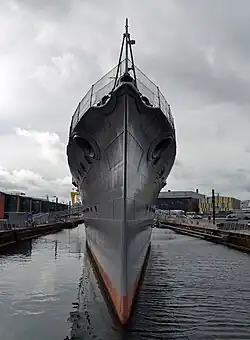 A ship's bow should be designed to enable the hull to pass efficiently through the water. Bow shapes vary according to the speed of the boat, the seas or waterways being navigated, and the vessel's function. Where sea conditions are likely to promote pitching, it is useful if the bow provides reserve buoyancy; a flared bow (a raked stem with flared topsides) is ideal to reduce the amount of water shipped over the bow.[3]