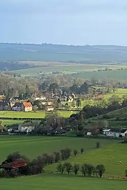 The main portion of the village is formed on the unique 'Bowerchalke greensand inlier' (an area of older rock completely surrounded by younger layers), highlighted in green on the adjacent map. It is not immediately obvious to the naked eye or on the standard Ordnance Survey maps with 10 metre contours[26] but the apex is strikingly characterised by the 'island' drawn on the Andrews' and Dury's 1773 map.[27] Its presence can be detected in the friable sandy soils in the centre of the village.