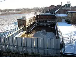 Later in 20th century, changes in electrical infrastructure led to decreased demand for hydroelectric power from the dam, and the structure fell on hard times until a 1977 agreement between the BMPC and the city of Lawrence conferred responsibility for dam maintenance on the city.[4] In 2011, BMPC broke ground on a new powerhouse on the north end of the dam, substantially increasing its power output.[10] The new north powerhouse was completed in 2013, and brought the dam to a 7MW capacity.[11]