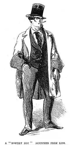 “[a] black silk hat, smoothly brushed, sitting precisely upon the top of his head, hair well oiled, and lying closely to the skin, long in front, short behind, cravat a-la sailor, with the shirt collar turned over it, vest of fancy silk, large flowers, black frock coat, no jewelry, except in a few instances, where the insignia of the engine company to which the wearer belongs, as a breastpin, black pants, one or two years behind the fashion, heavy boots, and a cigar about half smoked, in the left corner of his mouth, as nearly perpendicular as it is possible to be got. He has a peculiar swing, not exactly a swagger, to his walk, but a swing, which nobody but a Bowery boy can imitate.”[2]: 178