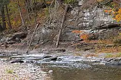 Bowman Creek is at the eastern boundary of the North Mountain region of Pennsylvania. To the east of the creek, there are considerably lower mountains, such as Bowman's Mountain and Eaton Knob. There is also a high divide between Bowman Creek and Mehoopany Creek.[20] A steep, east-facing slope known as the Bowman Creek Ledges is located along the creek in Eaton Township, Wyoming County. These ledges are made of sandstone and shale.[21]