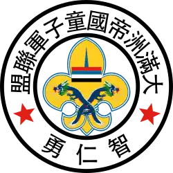 ![]() Top text: "大滿洲帝國童子軍聯盟" (The Boy Scouts Alliance of the Empire of Great Manchuria); bottom text: "智、勇、仁" (Wisdom, Courage, Benevolence) | |||