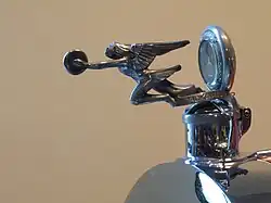 Motometers were at first aftermarket devices. Later, vehicle builders (not only car manufacturers) began to offer them as standard or optional equipment, and dealerships began to offer them also, sometimes as give-away or incentive items. The MotoMeter Company soon delivered these with metal dials inside that showed the maker's or dealer's logo with script printed on it. The standard motometer came in three sizes: for small cars, medium cars, and large cars and trucks. There were also slight changes to each of the original models and new designs, and accessories such as hood ornaments, toppers, illuminating devices or locks were added to the line of meters while some others were discontinued. Toppers were small metal castings that fitted to a bracket on the motometer. They were used in a similar way as modern decals showing the vehicle owner's heritage, profession, preferences, his business, his preferred sports, or even a political statement.[1][2][3] Toppers were also offered by other novelty producing companies, Ronson among them.[4] Boyce kept several patents on its products and fought infringements.[5]