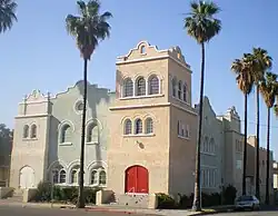 In the early 1910s, Boyle Heights was one of the only communities that did not have restricted housing covenants that discriminated against Japanese and other people of color.[17] The Japanese community of Little Tokyo continued to grow and extended to the First Street Corridor into Boyle Heights in the early 1910s.[18] Boyle Heights became Los Angeles’s largest residential communities of Japanese immigrants and Americans, apart from Little Tokyo. In the 1920s and 1930s, Boyle Heights became the center of significant churches, temples, and schools for the Japanese community. These include the Tenrikyo Junior Church of America, the Konko Church, and the Higashi Honganji Buddhist Temple; all designed by Yos Hirose. The Japanese Baptist Church was built by the Los Angeles City Baptist Missionary Society.[19] A hospital, also designed by Hirose, opened in 1929 to serve the Japanese American community.[20]