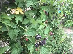 Boysenberries grow on low, trailing plants.[3] It is a large aggregate fruit with a deep maroon color, weighing 8 grams (0.28 oz) and containing large seeds.[3][4] The fruits are characterized by their soft texture, thin skins, and sweet-tart flavor. Mature fruits leak juice very easily and can start to decay within a few days of harvest.[3]
