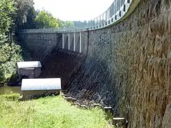 The barrier is a crooked gravity dam made of concrete with rubble stone cladding. It was renovated in 2000 and was the first dam in Germany to be sealed with a plastic sealing sheet (geomembrane) of PVC on the reservoir side. In 1955 it had already been reinforced with concrete on the reservoir side.