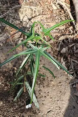 A species of tree belonging to the genus Brachychiton, it reaches up to 25 metres in height. The leaves are dropped during the dry season, a time of year the species favours for reproduction, and return as pale to coppery coloured new growth. The flowering period is during September, the profuse display of green to white bell-shaped flowers appearing at the terminus of the branches; the width of each flower is around 10 mm. Fruiting pods appear from January to February, these are 3 cm long, brown, and boat-shaped. During the later stages of growth the trunk begins to form an exaggerated bottle shape, and the leaves alter from a deeply lobed shape, divided from five to nine times, to a glossy and often elliptical leaf 12 to 20 cm long.[2]