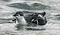 These are small chunky auks, no more than 25 cm long. Like other auks, they have plumage that varies by season. The non-breeding appearance is typically white underneath with mainly black upperparts. The breeding plumage is distinctive in this group; most auks are strongly contrasted with black and white when breeding, but Brachyramphus species are mainly brown, with pale feather edges giving a scaly appearance; the central underparts, normally below the surface on a swimming bird, are white.