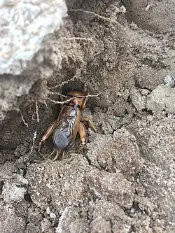 The crickets live almost entirely underground, each in its own burrow. Mating takes place in the male's burrow and the female may remain there till the eggs are laid, in a walled-off side tunnel.[4] In Zimbabwe, breeding takes place in February and March. The female lays around two hundred eggs which hatch about a month later. The nymphs crawl out of the burrow and disperse, each digging a burrow of its own. At first the nymphs grow rapidly but growth slows during the dry season from June to October. When succulent young plant material becomes available in November, growth rates speed up, with adults emerging from December onwards. There is just one generation each year.[3]