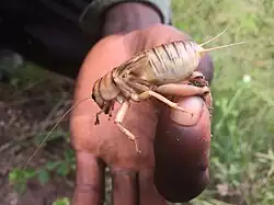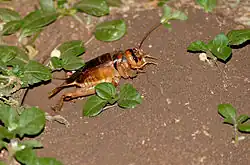 - ^ a b c d Büttiker, W.W.; Bünzli, G.H. (1958). "Biological Notes on the Tobacco Cricket, Brachytrupes membranaceus (Dru.) (Orthopt., Gryllidae), in Southern Rhodesia". Bulletin of Entomological Research. 48 (1): 49–57. doi:10.1017/S0007485300053426.