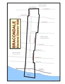 Bracondale was a provincial electoral district in Toronto, Ontario, Canada. It was represented in the Legislative Assembly of Ontario from 1926 to 1967. The constituency got its name from an old Toronto suburb called Bracondale, that was annexed by Toronto in 1909. Its most notable event was electing one of the first two women Members of the Provincial Parliament (MPP) to share the title "first-woman MPP" in 1943 when Rae Luckock was elected. In 1965, Bracondale's MPP, Joseph Gould, died in office sparking the final election held in the constituency. George Ben won the by-election, and became the constituency's last MPP. It was abolished for the 1967 Ontario provincial election, and redistributed into the Dovercourt and Bellwoods constituencies. As of 2023, the current electoral districts of Davenport, St. Paul's, University–Rosedale, and Spadina–Fort York encompass this historic riding.[1]