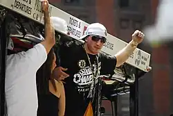 On September 7, 2012, the Bruins extended Marchand's contract by four more years, with his salary carrying an average annual value of $4.5 million.[46] When the 2012–13 season was indefinitely delayed due to a lockout, many of Marchand's teammates struck deals to play in European hockey leagues, an option that Marchand met with trepidation.[47] He ultimately chose to wait out the lock-out, and did not play professional hockey until the season began in January 2013. Paired with Bergeron and Seguin, both of whom spent the lock-out in the Swiss National League, Marchand worried that he would be out of practice compared to his teammates.[48] He ultimately scored 18 goals and 18 assists for 36 points in 45 games of the 48-game lockout-shortened season, which in a regular 82-game season anticipated that he would have scored over 30 goals and recorded over 35 assists for 65 points.[25] As the Bruins defeated the fifth-seeded Toronto Maple Leafs in seven games in the first round of the 2013 playoffs, Marchand scored his first postseason overtime goal in Game 1 of the second round series against Henrik Lundqvist of the sixth-seeded New York Rangers.[49] After defeating the Rangers in five games in the second round and sweeping the top-seeded Pittsburgh Penguins in the third round to clinch their spot in the 2013 Stanley Cup Final, the Presidents' Trophy-winning Chicago Blackhawks overpowered the Bruins in the Finals, defeating them in six games.[50]