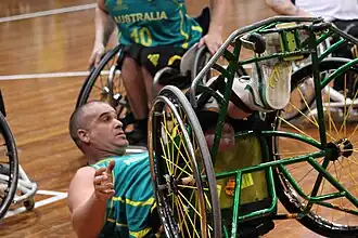 In 2001, Ness competed at the AOZ World Cup, where his team came in first, and he was named as part of the All-Star Five.[5] He was part of Australia's 2003 Kitakyushu Champions Cup championship team, as well as the 2004 Asia Oceania Cup champion team.[17] In 2004, he was a member of the national team that came in first place at the Roosevelt Cup. He was also part of the AOZ Paralympic qualifying tournament team that finished first. He was named a member of the AOZ All-Star Five at the tournament.[5] In 2005, he was part of the squad that competed at the Paralympic World Cup that won a silver medal.[5] In 2006, he was named the captain of the Australian team, and was part of the Paralympic World Cup team that won a silver medal. That year, he was also part of the squad that won a bronze medal at the World Championships.[5] In 2008, he was part of the team that took gold at the Beijing Paralympics.[5] He was on the team that competed in the Rollers World Challenge held in August 2009,[5] where he scored 17 points in the match against Japan.[18] He was part of the team that competed at IBWF AOZ Oceania Championship 2009 and won gold.[5] At the Oceania championships, he scored 9 points and had 10 rebounds in the final match against Japan.[12] He was past of the Australian team at the 2010 IWBF World Championships held in Birmingham, England, that won a gold medal,[5] the team that competed at the Wheelchair Tri Series 2011,[5] and the gold medal-winning Australia men's national wheelchair basketball team that competed at the 2010 Wheelchair Basketball World Championship.[19][20][21] Ness was a member of the Rollers team that won the gold medal at the 2014 Wheelchair Basketball World Championship.[22]