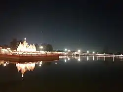 A sacred shrine dedicated to Shiva stands within the sarovar, accessible by a small bridge. According to scriptures, bathing in this sarovar increases the sanctity of performing the 'ashvamedh yajna'. The Gita Jayanti celebrations are held each year in the last week of November and early December when a 'deep daan' ceremony of floating lamps in water and [Aarti] occurs.[3] This also happens to be the time when migratory birds from distant places arrive at the sarovar. The Birla Gita Mandir and Baba Nath's haveli and temple are the neighbouring attractions.