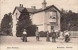 The line through Bramley & Wonersh was proposed by the Horsham and Guildford Direct Railway and was authorised by Parliament in August 1860.[9][10][11] The company was taken over by the London, Brighton and South Coast Railway (LB&SCR) on 29 June 1865.[10][11] Cranleigh station opened with the line on 2 October 1865, and all passenger trains were operated by the LB&SCR from the outset.[12][13][14] Two LB&SCR A1 class locomotives, named Bramley and Wonersh, were based at Bramley shed.[15][16] The shed was demolished by a storm in 1882 and thereafter the engines were housed at Guildford.[17]