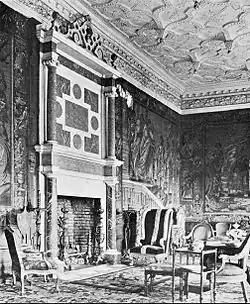The massive chimneypiece in the drawing room is classically designed, believed to be inspired by one of the great Italian architects of 16th-century Mannerism, Giacomo Barozzi da Vignola.[65] It is two storeys in height, the lower being Doric and the upper Ionic. The distribution of the members is regular, and the shafts of the columns are variegated marble. The upper compartment of the chimneypiece is composed of separate pieces of the same diversified material, and the frieze of the upper order also consists of coloured marble in the centre. The fireplace is 6 feet (1.8 m) wide and 4 feet 8 inches (1.42 m) high, and retains the ancient andirons, used for burning wood. These are large and well adorned, particularly in the lower part.[65]