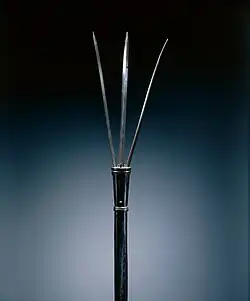 A brandistock (also called brandestoc, buttafuore or feather staff)[1] was a short type of polearm which was used by both infantry and civilians alike, primarily police officers in Italy between the 16th and 19th centuries. Measuring some 1.5 meters (5 ft) long, the brandistock construction was unique for polearms in that it had a retractable blade; the weapon was able to be covertly carried as a walking staff.[2] The head consisted of either a single or a trio of long thin points, which were kept in a hollow aperture inside the rest of the shaft.[3] The blades would often be triangular or diamond-shaped.[2] A sharp thrust of the weapon forward propelled the heads out, where they could be readily locked in place.[4] This weapon is essentially a spear with a sliding blade, or alternatively, a long handled out-the-front gravity knife.[1]