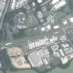In 1947, William B. Wilson purchased the airport,[6] which had two grass runways (the current runway 9/27, a perpendicular runway 18/36), and several maintenance buildings.[11] The airport underwent significant improvements in the 1980s. Runway 9/27, as well as the taxiways and ramps, were all paved, and a new terminal building was constructed. In 1982, the airport was renamed Brandywine Airport. Expansion of the neighboring industrial park also led to the removal of Runway 18/36.