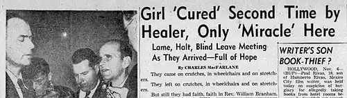 Branham's meetings were regularly attended by journalists,[114] who wrote articles about the miracles reported by Branham and his team throughout the years of his revivals, and claimed patients were cured of various ailments after attending prayer meetings with Branham.[114] Durban Sunday Tribune and The Natal Mercury reported wheelchair-bound people rising and walking.[115][116] Winnipeg Free Press reported a girl was cured of deafness.[117] El Paso Herald-Post reported hundreds of attendees at one meeting seeking divine healing.[118] Despite such occasional glowing reports, most of the press coverage Branham received was negative.[110]