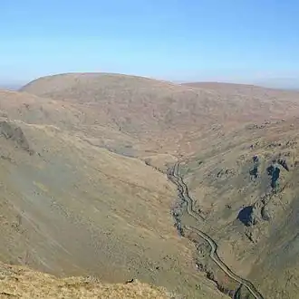 | Branstree seen from Goat Scar to the South. The Gatescarth Pass track is seen in the valley below | |